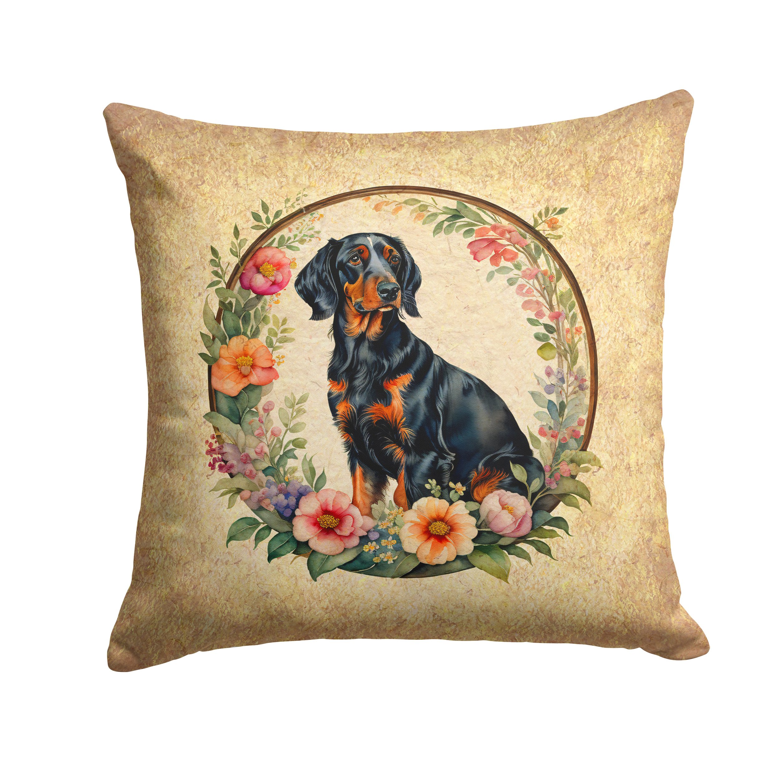 Gordon Setter and Flowers Throw Pillow Machine Washable, Indoor Outdoor Decorative Pillow for Couch, Bed or Patio, 14Hx14W